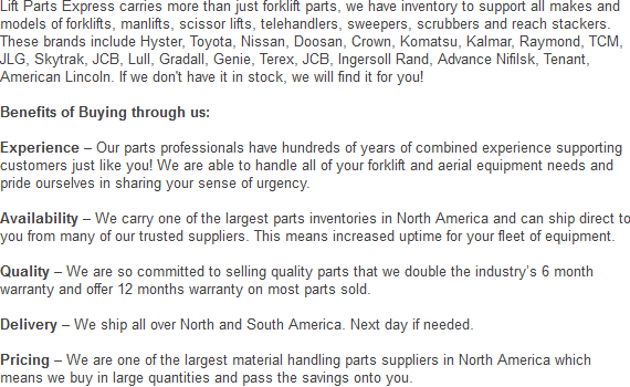 We have first-rate prices on all our forklift parts. Give us a phone call now if you are interested in getting a price quote on our parts or attachments. Call us at: